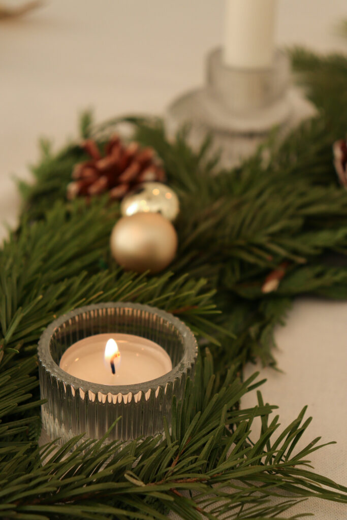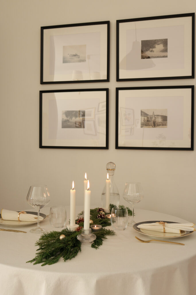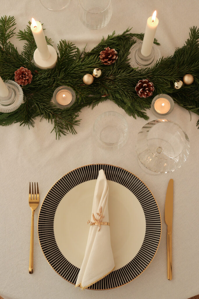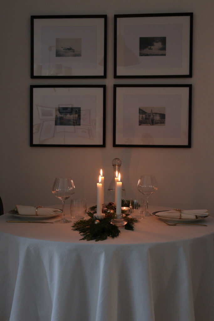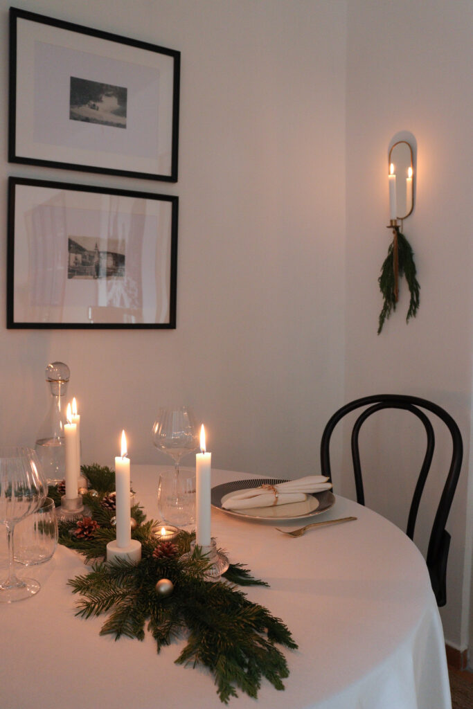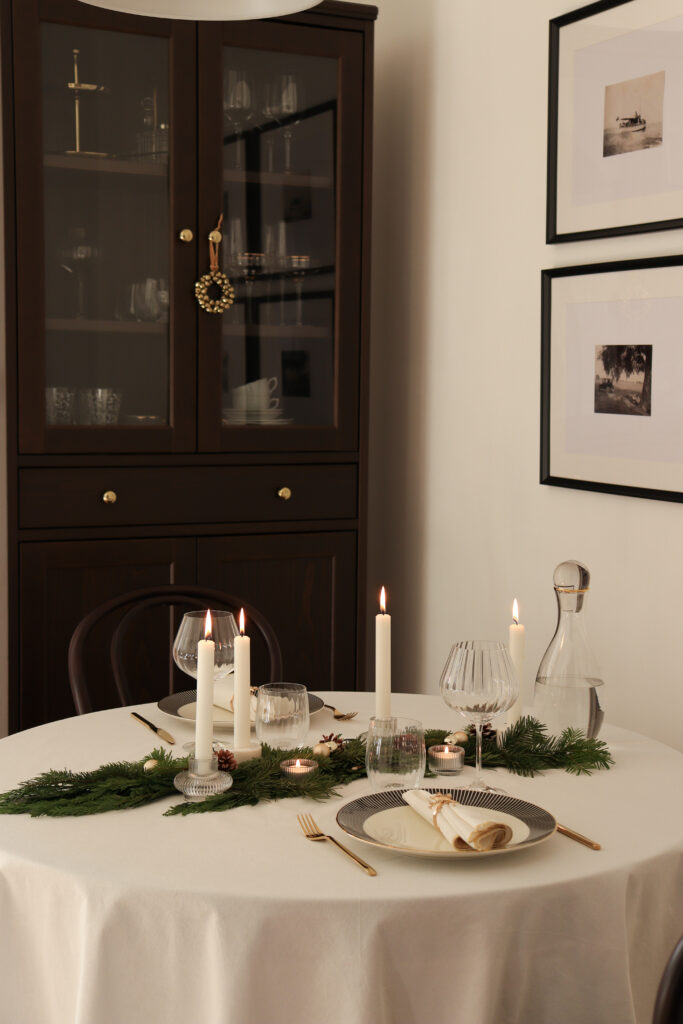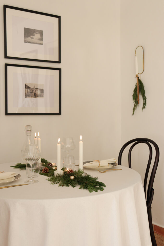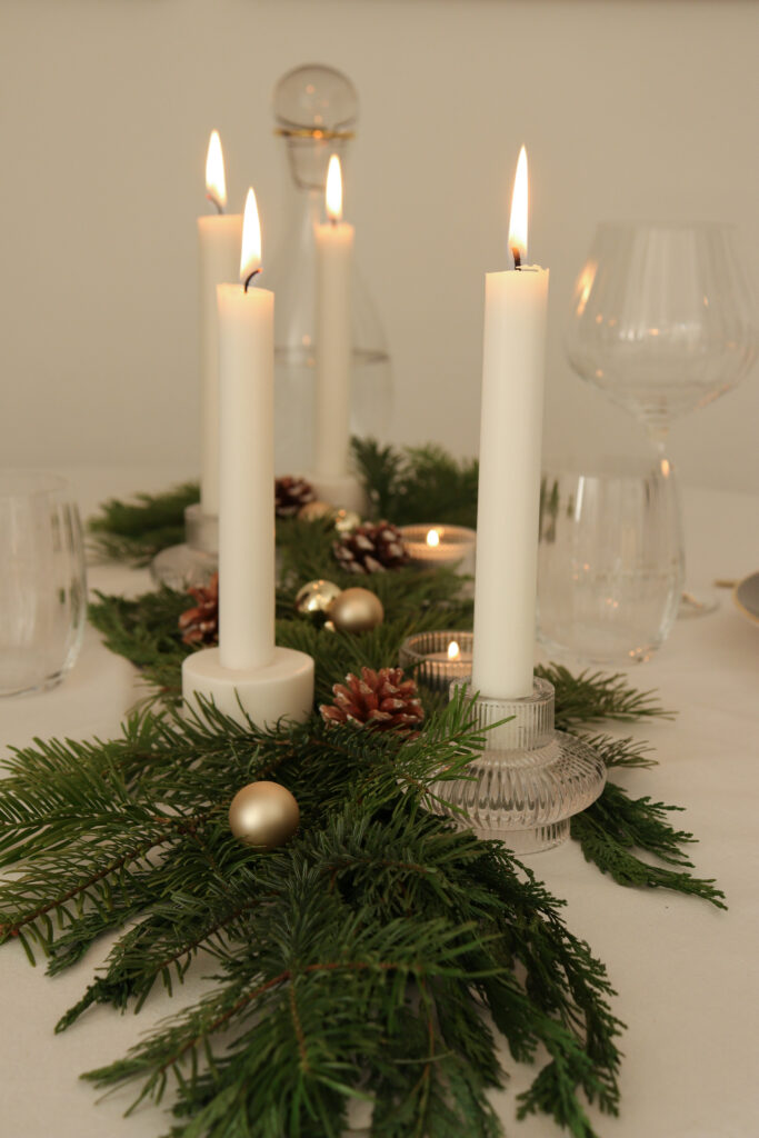 Az asztalt két főre terítettem meg, ahol az ünnepi vacsorát fogyasztjuk majd a férjemmel szenteste. Ugyanakkor egy nagyobb méretű, téglalap alakú asztalon is szépen mutat a középen végigfutó, fenyőágakból és gyertyákból álló, természetes dekoráció, tehát több főre terítve is hasonló hatást kelt. Én szeretem az alacsonyabb asztali dekorációt, amikor látom a velem szemben ülőt anélkül, hogy egy magasabb növény ágain vagy hosszú gyertyatartókon keresztül keresem a szemkontaktust. Ezért döntöttem az alacsonyabb gyertyatartók mellett.