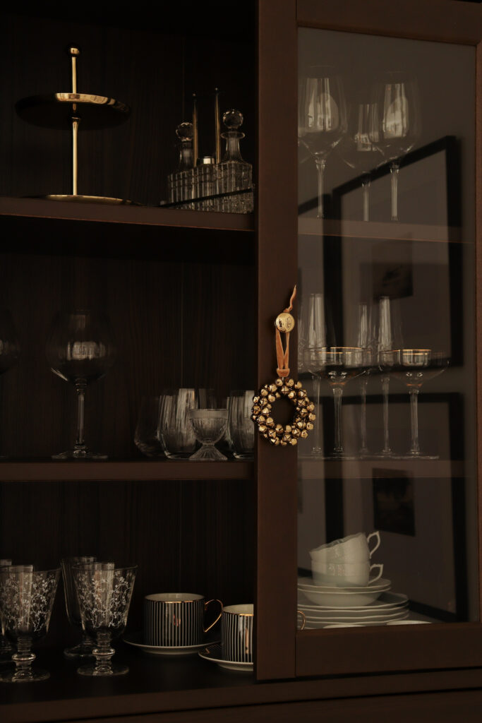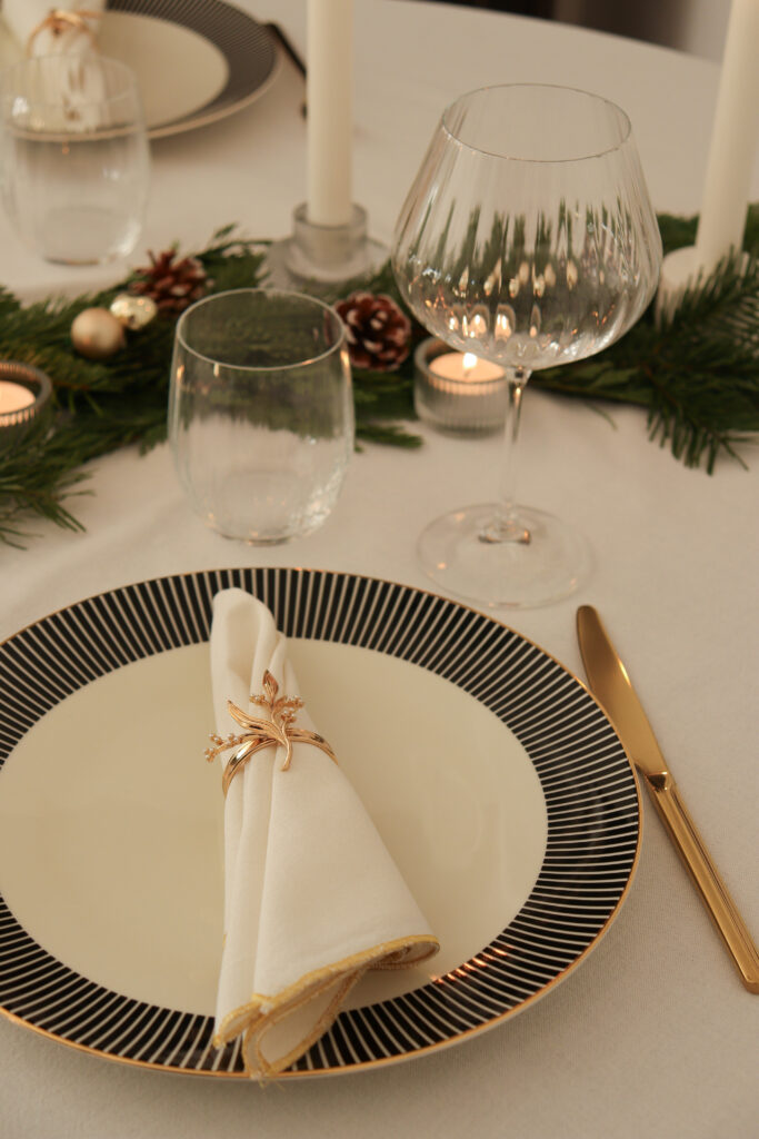 A fehér falak és a sötét bútorok kontrasztjához jól illik a tányérok mintája – a fekete-fehér kombináció mindig elegáns – a finom arany szegély pedig az evőeszközökkel van harmóniában. A szalvétagyűrűk, annak ellenére, hogy fagyöngyöt mintáznak szerintem nem csak a karácsonyi asztalon használhatók, ahogyan a teríték többi része sem kifejezetten karácsonyi. Éppen ezt kedvelem az egyszerű és klasszikus tárgyakban, hogy éveken át, más-más szezonban is variálhatók, ezért bátran használjuk őket, nem csak a szekrényben porosodnak, várva a megfelelő alkalmat. Persze nincs semmi baj egy karácsonyfa mintás étkészlettel sem, amit az évnek csak ezen a néhány napján veszünk elő. Ez már ízlés és tárolóhely kérdése 🙂