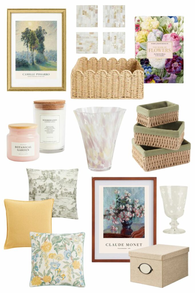 Arany képkeret – Ikea; Művészeti poszter – Posterstore; Gyöngyház poháralátétek – Zara Home; Fonott tároló – Zara Home; Redouté: The Book of Flowers – Taschen; Illatgyertyák, mintás váza – H&M Home; Fonott tárolók zöld szövettel – Pepco; Zöld mintás díszpárnahuzat – Zara Home; Sárga és virágos párnahuzat – H&M Home; Művészeti poszter – Posterstore; Barna képkeret – H&M Home; Virágmintás pohár – Zara Home; Bézs doboz – Ikea