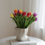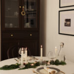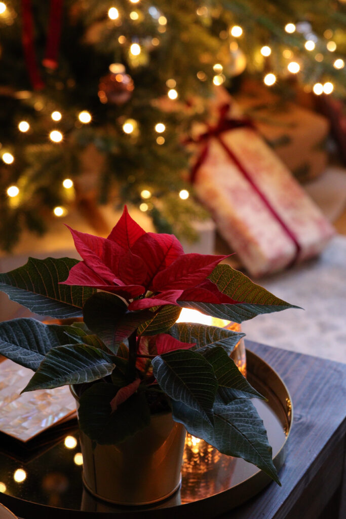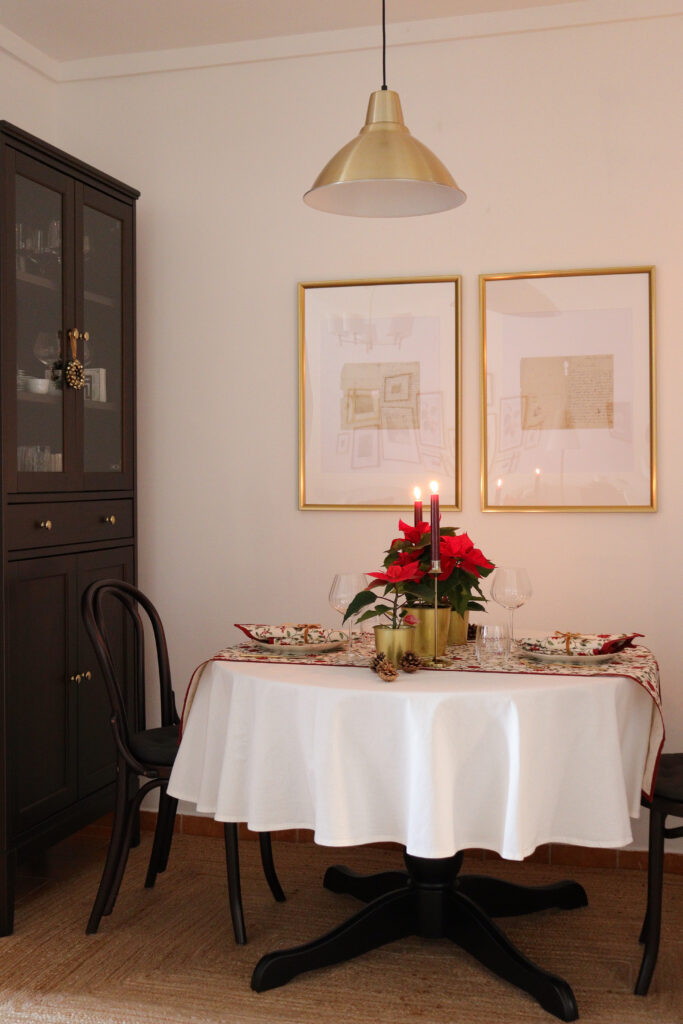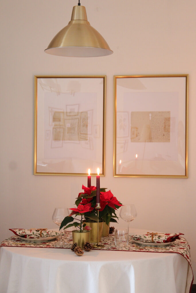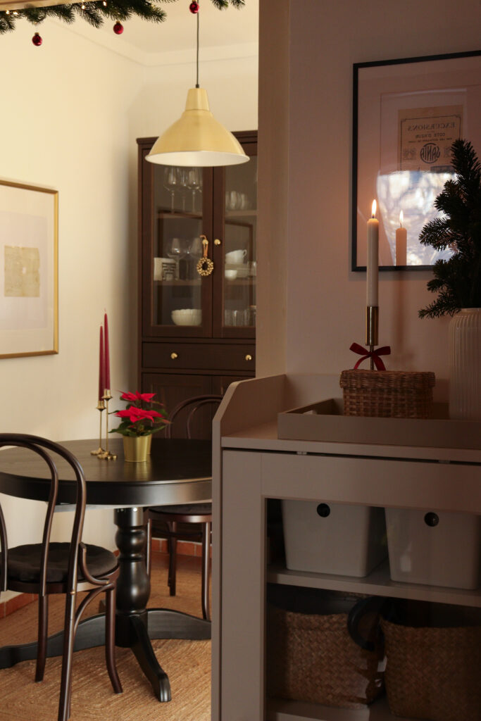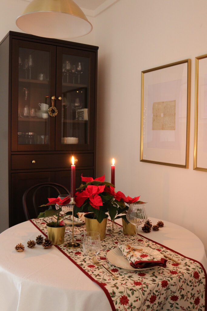 A klasszikus vonalon maradva a mikulásvirág mellett döntöttem, ezért az ünnepi asztalra is őket választottam asztaldísznek. A tavalyi, letisztult, fehér színvilágba idén vittem egy kis csavart a vörös színnel és a mikulásvirágos asztali kiegészítőkkel. Szerintem remekül illik az étkező arany részleteihez, mint a képkeretek, a lámpa vagy az evőeszközök. A kávépulton helyet kapott néhány karácsonyi csésze és bögre, amiket egyébként nem csak az ünnepek alatt használunk, hanem egész évben.