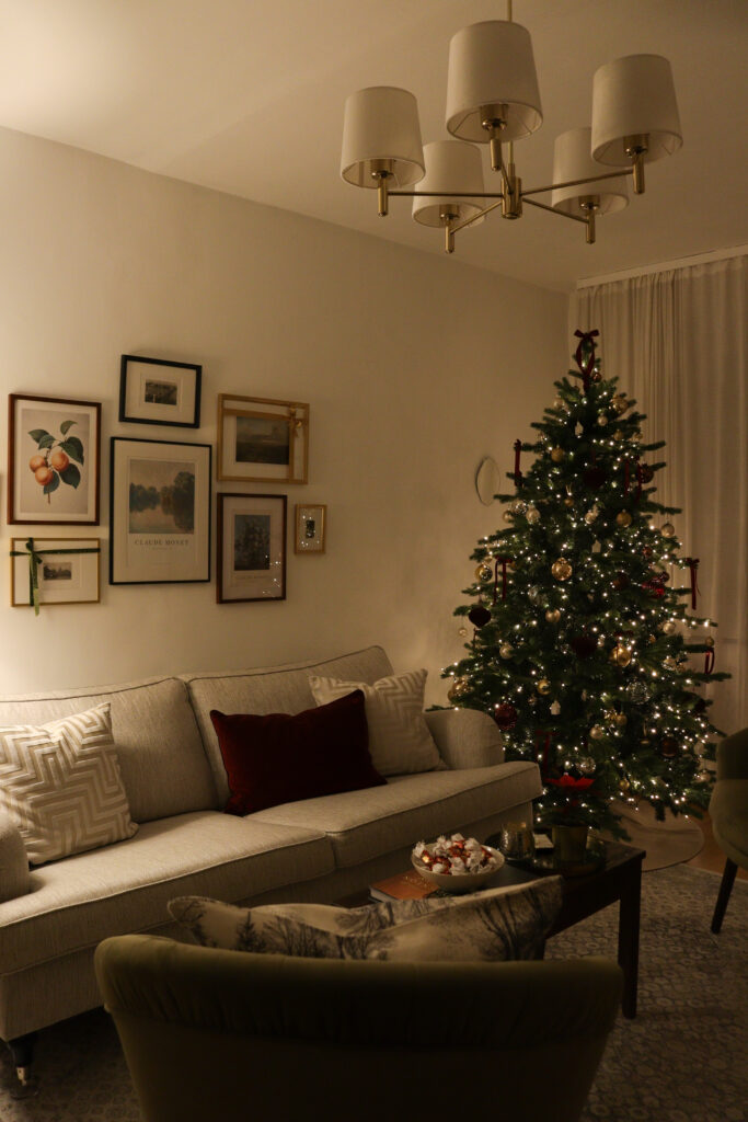 A kedvenc terem a nappali, mert ezt tudtuk az évek során a bérelt lakásban leginkább a saját képünkre formálni, ezért szívesen dekorálom. Idén szerettem volna több színt vinni a dekorációba, mint tavaly, amikor főként az arany és fehér színek domináltak. Most az arany mellé a hagyományosabb bordót választottam, ami a zöld és barna árnyalatokkal keverve klasszikus hatást kelt.